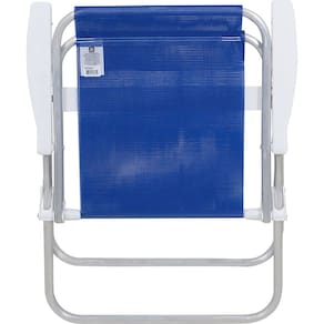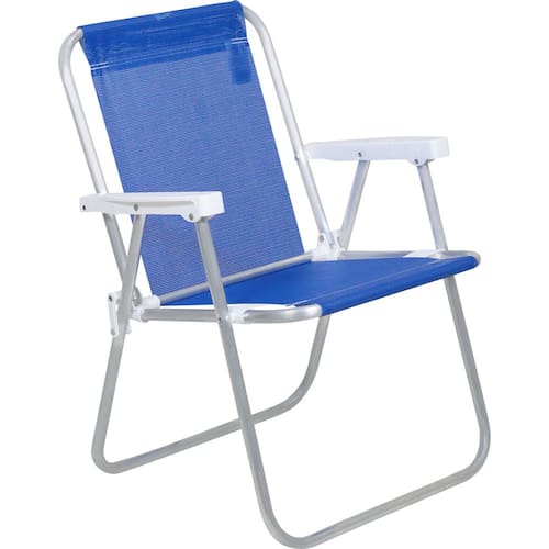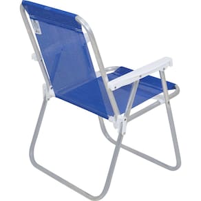 Especificações • Cor: Azul • Peso Suportado da Cadeira: 110 Kg • Medidas da Cadeira: 54 cm x 53 cm x 71 cm • Altura do Assento: 35 cm • Dobrável: Sim • Estrutura: Alumínio • Apoio para os Braços: Sim • Reclinável: Sim • Material: Poliéster, PVC, Alumínio e Polipropileno