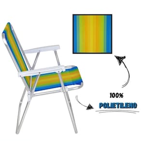 Relaxe com estilo e conforto com a Cadeira de Praia Alta em Alumínio Degrade AZUL, VERDE e AMARELO 2242 da MOR. Dobrável e fácil de carregar, esta cadeira é ideal para ser levada à praia, pescarias ou camping, graças à sua estrutura leve e resistente em alumínio. O alumínio garante maior durabilidade, mesmo em regiões litorâneas, enquanto a tela em 100% polietileno proporciona conforto e resistência.