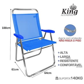Por ser mais larga e mais resistente a cadeira king é indicada para pessoas com até 140kg. Fabricada em alumínio de alta resistência e que não enferruja. Possui proteção que não risca o chão. Além disso, pode ser utilizada em diversos ambientes, como praia, camping e jardim, proporcionando ótimos momentos de lazer.