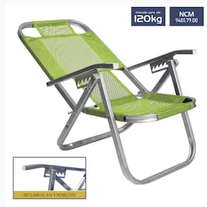 Cadeira de Praia Reclinável Alta Ipanema Verde CAD0395 Botafogo A Cadeira de Praia Reclinável Alta Ipanema Verde Primavera é a escolha ideal para quem deseja conforto, praticidade e um toque de sofisticação para seus momentos de lazer. Parte da linha premium da Botafogo Lar & Lazer, a cadeira Ipanema é a preferida dos cariocas e, se você visitar o Rio de Janeiro, com certeza irá se deparar com ela nas famosas praias da cidade. Com estrutura de alumínio retangular e assento em tela de PVC Sannet, a cadeira oferece resistência e conforto excepcionais, além de ser dobrável e reclinável em até 5 posições, permitindo o ajuste perfeito para o seu descanso. Ela suporta até 120 kg e é superleve, com apenas 2,70 kg, o que facilita o transporte para qualquer lugar. Especificações: Medidas da Cadeira Aberta:Largura do Assento: 44 cmAltura do chão ao assento : 34 cmAltura do Encosto: 67 cmMedidas quando fechada:Comprimento x Largura x Altura L x C x H : 58 x 9,5 x 82,5 cmPeso: 2,70 kgCapacidade Máxima: 120 kgCor: Verde Primavera de 3 meses fornecida pelo fabricante. Imagens meramente ilustrativas. Código Interno: 230657 Modelo: CAD0395 EAN: 7908155402058 Marca: Não Informado