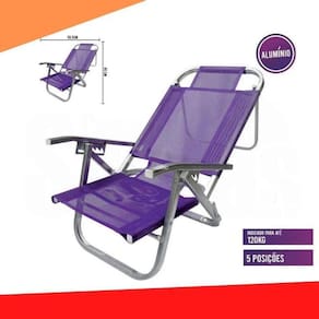 Cadeira Praia Copacabana Reclinavel ROXAA Princesinha do mar, Cadeira de praia reclinável em 5 posições de altura do encosto, com apoio, estrutura em alumínio retangular e tecido em tela de PVC com Poliéster. Com elegante estrutura retangular e reforçada, é uma cadeira extremamente leve, confortável e prática.DescriçãoCadeira Reclinável 5 Posições Reforçada, Estrutura Em Alumínio Quadrado, Tela Em PVC Sannet Roxa, Braço Em Alumínio, Com Suporte De Apoio para Deitar, Indicado Até 120 Kg, Acabamento Em PolipropilenoMedidas Cadeira: Largura do Assento: 44.5cm / Altura chão ao assento : 28.5cm / Altura Encosto : 47 cm;Medidas Fechada: 57 x 10 x 86 cm - L x C x H;Peso: 2,78 Kg;Suporta até 120 Kg;Cor: Roxa;Marca: Botafogo Lar & Lazer;Garantia: 90dd;Materiais da estrutura: AlumínioMaterial do assento: PoliésterQuantidade de posições: 5É dobrável: SimComprimento x Largura x Altura: 9 cm x 57 cm x 85 cmPeso máximo suportado: 120 kg