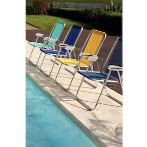 INFORMAÇÕES GERAIS DA CADEIRA DE PRAIA TRAMONTINA EM ALUMÍNIO COM ASSENTO AZUL - Peso Máximo Recomendável: 110 kg; -Fabricação: Apoios em polipropileno injetado, tubo em alumínio natural e tela em poliéster com proteção ANTI-UV; - Modelo: Dobrável com antiderrapante.