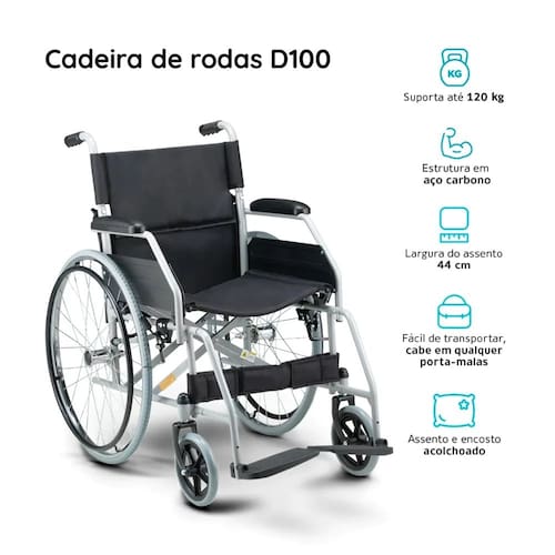 Além disso, a cadeira de rodas D100 possui uma estrutura dobrável, equipada com o sistema em duplo X, garantindo praticidade no transporte e armazenamento.