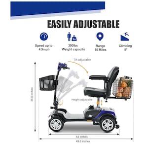 Assento Confortável: Este scooter de mobilidade para idosos apresenta um assento totalmente acolchoado em couro sintético, com altura ajustável, adequado para usuários de quase todas as alturas. Além disso, o assento é rodeado por dois apoios de braço acolchoados, que podem ser ajustados e inclinados para maior conveniência ao embarcar ou desembarcar.