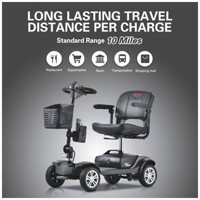 Especificações do Scooter: O scooter Metro Mobility, equipado com um motor potente de 300 Watts, tem alcance de até 16 km por carga. Projetado para suportar com segurança até 136 kg, o scooter elétrico e seus pneus sólidos de 23 cm foram desenvolvidos para oferecer segurança e durabilidade. O raio de giro é de 117 cm e a inclinação máxima é de 10°.