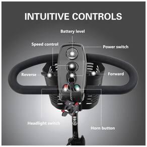 Controle com Uma Mão e Navegação Segura: O scooter de 4 rodas com manoplas ergonômicas permite operá-lo com uma única mão, oferecendo descanso para o pulso. Também é amigável para pessoas canhotas. O scooter motorizado vem equipado com faróis e luzes de freio traseiras, garantindo visibilidade e segurança ao iluminar o caminho e alertar motoristas atrás durante a noite.
