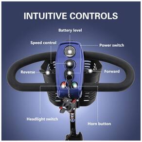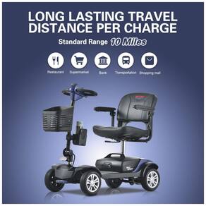 Especificações do Scooter: O scooter Metro Mobility, com motor potente de 300 Watts, oferece um alcance de até 16 km por carga. Projetado para suportar até 136 kg com segurança, o scooter elétrico e seus pneus sólidos de 23 cm foram feitos para garantir segurança e durabilidade. O raio de giro é de 117 cm e a inclinação máxima é de 10°.