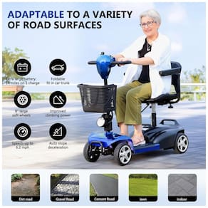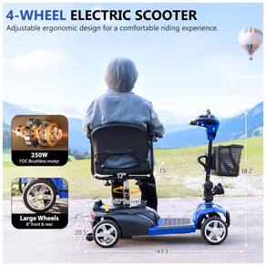 Scooter de Mobilidade: O scooter de 4 rodas é equipado com motor sem escova de 250W e bateria de alta eficiência para garantir um passeio suave e potente. Projetado para suportar com segurança até 120 kg, o scooter e seus pneus foram desenvolvidos para durabilidade. Sua velocidade máxima é de 8 km/h e ele pode percorrer até 22 km por carga.