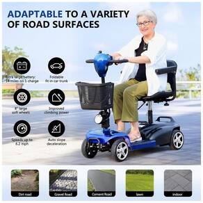 Scooter Motorizada de 4 Rodas: Equipado com motor sem escovas de 250W e bateria de alta eficiência, suporta até 120 kg e possui autonomia de 22 km com velocidade máxima de 8 km/h.