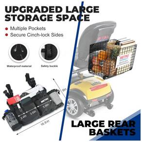 Espaço de armazenamento ampliado: O scooter inclui uma cesta frontal, uma grande cesta traseira e uma bolsa lateral, oferecendo bastante espaço para itens essenciais de viagem, compras e uso diário.