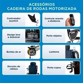 Modelo: XFGW30-107 reclinável através de controle remoto Ideal para uso interno e externo Sistema de amortecimento no chassi e rodas Compacta e prática Confortável - Almofada com 5cm de espessura Estofado em material impermeável de alta resistência com tiras tensoras ajustáveis Possui autonomia para até 20 km no plano com carga completa Velocidade max: 6 km/h Joystick / controle padrão VR2 com indicador de carga, ajuste de velocidade e buzina Controle Remoto Sem Fio (Além do Joystick fixo a cadeira possui um controle remoto) Passa facilmente por portas estreitas de até 70 cm Raio de giro de apenas 87 cm permitindo que a cadeira seja capaz de manobrar em espaços pequenos Rodas traseiras: anti-tombo Rodas traseiras: Paralamas Apoio de Braços rebatível Apoio de pés rebatível Apoio de cabeça regulável Cinto pélvico Acompanha Carregador de baterias BIVOLT Roda dianteira: 8 polegadas PU sólido / antifuro - Roda liga leve , alumínio Roda Traseira: 12 polegadas PU pneumático Inflável com câmara de ar Roda liga leve, alumínio.