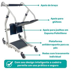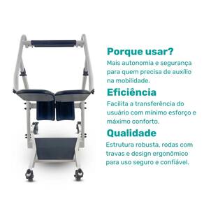 Com estrutura robusta, assento de apoio frontal e plataforma antiderrapante para os pés, permite que as transferências do leito para a cadeira, do banheiro para o quarto ou para outros ambientes essenciais sejam realizadas de forma rápida, segura e sem esforço.