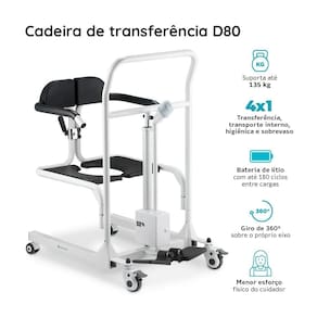 A Cadeira de Transferência D80 Dellamed é uma solução versátil e resistente, especialmente projetada para atender às necessidades de pessoas com mobilidade reduzida. Com capacidade para suportar até 135 kg, esta cadeira apresenta um sistema de elevação eletrônica que facilita a transferência do usuário entre diferentes locais.
