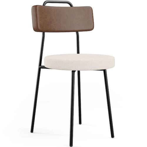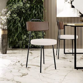 Revestimento do encosto em Couríssimo na cor Marrom e do assento em Linho na cor Cru, com acabamento semi brilho.