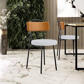 Revestimento do encosto em Couríssimo na cor Whisky e do assento em Linho na cor Cinza, com acabamento semi brilho.