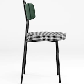 Revestimento do encosto em Facto na cor Verde Musgo e do assento em Veludo na cor Pied Poule, com acabamento semi brilho.