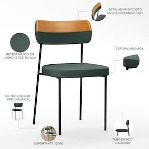 Encosto e assento estofados com espuma laminada, revestidos em Linho Verde e Couríssimo Whisky .