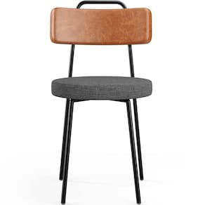 Revestimento do encosto em Couríssimo na cor Camel e do assento em Linho na cor Linho Cinza Escuro, com acabamento semi brilho.