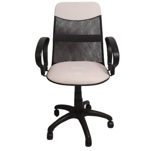 Cadeira diretor tela giratória com faixa e braço fixo corano branco Cadeira Diretor - braço fixo - estrutura do encosto em aço, revestida em tecido tela com faixa e detalhe em corano - assento em madeira reflorestada - espuma injetada, revestida em couro sintético e bordas em pvc flexivel, flange universal, base estrela em nylon com rodizio - regulagem de altura a gás. Marca: Sintonia Flex