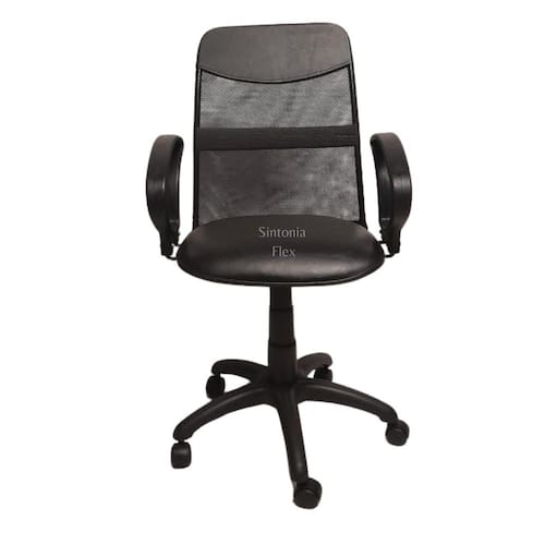 Cadeira diretor tela giratória com faixa - mecanismo relax - braço fixo corano preto Cadeira Diretor - braço fixo - estrutura do encosto em aço, revestida em tecido tela com faixa e detalhe em corano - assento em madeira reflorestada - espuma injetada, revestida em couro sintético e bordas em pvc flexivel, mecanismo relax , que permite o inclinamento do encosto, base estrela em nylon com rodizio - regulagem de altura a gás. Marca: Sintonia Flex