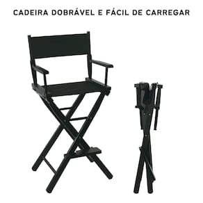 Especificações: - cor: preto - material: alumínio estrutura e nylon assento e encosto - dimensões do assento: 58x42cm largura x profundidade - limite de peso máximo: 180 kg; - altura até o assento: 75 cm; - altura máxima até o encosto de cabeça: 140cm cm; - peso do produto: 5,5kg - acompanha: cadeira diretora/maquiadora, encosto para cabeça, apoio para o pés, bolsa de transporte