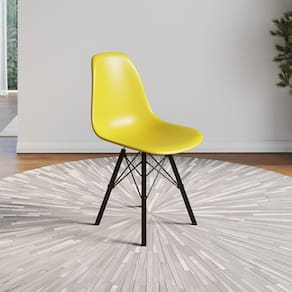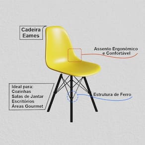 ATENÇÃO AS IMAGENS SÃO MERAMENTE ILUSTRATIVAS E PODEM SOFRER VARIAÇÕES DE COR E PEQUENOS DETALHES DE ACORDO COM O SEU MONITOR, ILUMINAÇÃO DO AMBIENTE E ATÉ MESMO A SUA PERCEPÇÃO VISUAL.Cadeira Eames Estilo Moderno em Ferro Preto com Assento Amarelo