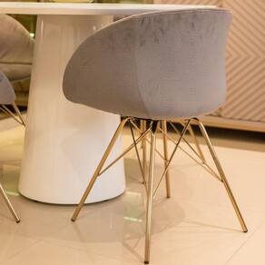 As peças com metais dourados estão super em alta no mundo do design, além do veludo que também é uma tendência muito forte para os estofados. A Cadeira Eleonora combina estes dois atributos e garante uma pela elegante e funcional para seu dia a dia! Cadeira fixa para utilização em ambientes internos, não possui apoio para braços, possui encosto para as costas, assento estofado com estrutura em polipropileno (PP) e revestido em tecido aveludado. Possui base fixa em aço cromado na cor dourada. Acabamento da Estrutura: Cromada Almofada do assento: Fixa Altura do assento até o chão: 48.5 Ambiente Principal: Sala de Jantar Apoio para Braços Estofado: Complexidade da Montagem: Baixa: pode ser montado por uma pessoa sozinha Cor: Cinza Cor do Produto: Cinza Dobrável: Não Enchimento do Assento: Espuma D-24 Enchimento do Encosto: Espuma D-24 Escala de Brilho: Semi-Brilho Estrutura do Assento: Polipropileno, Estrutura do Encosto: Polipropileno Giratória: Não Informações Complementares: Cadeira fixa para utilização em ambientes internos, não possui apoio para braços, possui encosto para as costas, assento estofado com estrutura em polipropileno (PP) e revestido em tecido aveludado. Possui base fixa em aço cromado na cor dourada. Itens Inclusos: 1 Cadeira, Kit Ferragens e Manual de Montagem Linha ou Coleção: Cadeiras Manual de Especificação Técnica: Manual de Montagem e Instalação: https://cdn2.madeiramadeira.com.br/atributo/rivatti/1202177-manual-eleonora-aj06.pdf Material da Base: Aço Cromado dourado Necessita Montagem: Sim Origem do Produto: Importado Peso: 5.6 Possui Apoio para Braços: Não Possui Apoio Para os Pés: Não Possui Rodízio: Não Recomendações de Uso, Manutenção e Limpeza: Uso interno. Não expor ao sol ou umidade. Não exceder a capacidade de peso. Limpar com pano macio umedecido em solução de água e sabão neutro e secar em seguida. Não utilizar produtos químicos ou abrasivos. Revestimento do Assento: Tecido tipo veludo 100% poliéster Revestimento do Encosto: Tecido tipo veludo 100% poliéster Rodízio com Trava: Sistema de Montagem: Encaixe e parafusos Tipo de Assento: Fixo Tipo de Encosto: Fixo Tipo de Madeira Maciça: