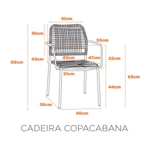A cadeira Copacabana é perfeita para áreas externas, com design moderno e descontraído. Possui estrutura resistente em quatro diferentes tons e revestimento em corda náutica, oferecendo estilo e durabilidade para diversos ambientes.