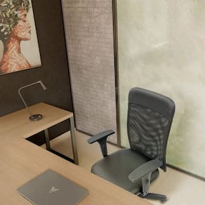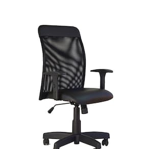 Cadeira giratória Sun de espaldar médio estruturado em tubo de aço revestido em tela de poliéster. Assento em madeira laminada estofado com espuma laminada com densidade D28. Revestimento em sintético preto.