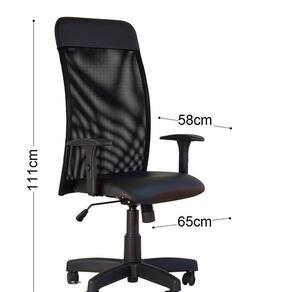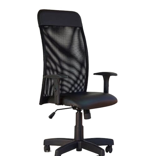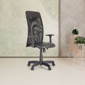 Cadeira giratória Sun de espaldar alto estruturado em tubo de aço revestido em tela de poliéster. Assento em madeira laminada estofado com espuma laminada com densidade D28. Revestimento em sintético preto.