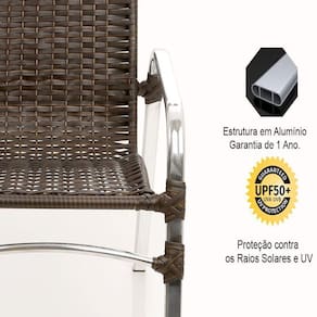 Nossos produtos são de altíssima qualidade e com design moderno, garantindo assim conforto e praticidade para seu bem-estar. Produzidos em estrutura de alumínio polido e revestida em fibra sintética. Mais leve e resistente do que o Ferro, o Alumínio também pode ser molhado, pois não enferruja. Possuem proteção UV, aumentando sua durabilidade contra ações do tempo. Podendo ficar exposto à sol e chuva por bastante tempo. Ideais para decorar ambientes clássicos e modernos como: Cozinha, Sala, Quarto, Varanda, Edícula, Piscina, Jardim, Área de lazer, Festa, Reunião, Churrasco. Disponibilizamos diversas opções de cores. Fibra Sintética especial - Resistente ao Sol e chuva com proteção UV. A fibra sintética da Trama /UP Mobille é produzida com materiais de altíssima qualidade. Essa característica oferece resistência suficiente para o móvel ser em decorações de ambientes externos - sem preocupações com sol ou chuva. Estrutura em Alumínio - Soldado na solda MIG, de alta resistência, alta durabilidade e garantia de 12 meses de fábrica. Produzida em estrutura de alumínio polido, durabilidade cerca de 8 à 10 anos, material pode ser molhado e utilizado em áreas abertas, exposto a sol e chuva. Design Moderno - Combinação em vários ambientes com traços modernos e clássicos, para todos os gostos! Fácil de Limpar - Utilize Sabão Neutro para a limpeza das fibras e estruturas. Para deixar o alumínio brilhoso, poderá ser passado cera automotiva em pouca quantidade, mantendo assim o brilho de suas peças. Passe um pouco de cera com um pano macio, logo em seguida, passe outro pano macio, porém seco para retirar a cera. Deixando assim, com o brilho novamente!