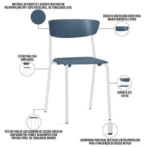 Características: Material do encosto e assento injetado em Polipropileno (PP) 100% reciclável, na tonalidade Azul. Pés em tubo de aço carbono de secção circular, com diâmetro 22mm e acabamento com pintura epóxi, na tonalidade Branco. Encosto com design curvo para maior conforto e apoio. Acompanha ponteiras injetadas em polipropileno para a prevenção de riscos no piso. Peso máximo suportado 120 kg. Estrutura fixa empilhável. Produto 100% Nacional.