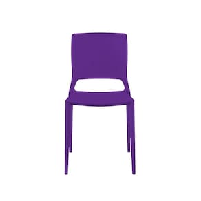 Seu design clean na cor roxa combina facilmente com diferentes estilos de decoração, do clássico ao contemporâneo, tornando-a versátil para salas de jantar, varandas, áreas gourmet, jardins, restaurantes e eventos. O modelo é empilhável, facilitando a organização e otimizando o espaço, sendo perfeito tanto para uso residencial quanto comercial.