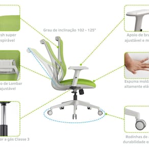 Cadeira Ergonômica office em Mesh com encosto médio em moldura cinza; Parte traseira de nylon com estofamento de malha de excelente qualidade com suporte lombar ajustável; Assento estofado em tecido elástico de ótima qualidade com espuma moldada; Apoio de braço ajustável com apoio em PU, moldura cinza e apoio em PU cinza; Mecanismo de alavanca com inclinação e travamento na função de 3 posições; Elevação á gás preto 5.100/50mm, classe 3; Base de nylon de cor cinza de 340 mm; Rodinhas em Nylon com Revestimento em PU Produto Montado: Sim Ambiente Principal: Escritório codigo_ean: 7909903943526 Complexidade da Montagem: Baixa: pode ser montado por uma pessoa sozinha Cor: Verde Cor do Produto: Verde Empilhável: Não Enchimento do Assento: Espuma Encosto Reclinável: Sim Itens Inclusos: 1 Cadeira (Desmontada), Manual para Montagem Ferramentas e Parafusos Manual de Montagem e Instalação: https://product-hub-prd.madeiramadeira.com.br/953720/documents/efed4268-c283-41db-a50d-9e2c3340bc4336411727289699953720113514.pdf Necessita Montagem: Sim Origem do Produto: Importado Peso: 15 kg Possui LED: Não Possui Rodízio: Sim Recomendações de Uso, Manutenção e Limpeza: Não Utilizar Produtos Químicos ou Abrasivos Evite Incidência Direta de Luz Solar Evitar Batidas e Contato com Objetos Cortantes Limpeza com Flanela Úmida ou Esponja não Abrasiva Não Deve Ficar em Local Exposto a Sol e Chuva Sistema de Montagem: Parafusos Suporta Até (kg): 230 kg undefined: 953718 Marca: Movescan