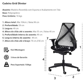 Modelo: Cadeira Escritório Grid Diretor Preta Assento: Madeira Revestido com Espuma e Acabamento em Tela Base: Polipropileno Profundidade: 59 cm Largura: 49 cm Altura Total: Alta 104 cm - Baixa 94 cm Altura do Chão Até o Assento: Alta 55 cm - Baixa 45 cm Altura do Chão Até o Braço: Alta 76 cm - Baixa 66 cm Medida Interna do Assento Profundidade 49 cm Largura 49 cm Peso Máx. Recomendado: 130 kgs Peso unitário: 16 kgs