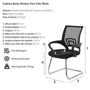 Modelo: Cadeira Escritório Basic Diretor Tela Mesh Preta Assento: Madeira Revestida de Espuma e Acabamento em Tela Mesh Base: Metal Cromado