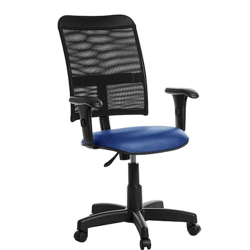Cadeira escritório giratória tela com braço rv cor azul Ideal para ambientes como: escritórios, corporativo, home office, consultórios, etc. Especificações: Revestimento: Cor do revestimento: azul; Tipo de revestimento: viena; Malha: 67% poliéster e 33% algodão; Material: vinil e c0urvin; Composição química: 13,8% de malha e 86,2% resina de vinila plastificada; Espessura aproximada: 0,09 cm +/-11% ; Detalhamento do assento: Espuma injetada de poliuretano; Largura 46 cm x espessura 5 cm x profundidade 42 cm; Detalhamento do encosto: Estrutura em aço preta revestida com tela mesh; Largura 45 cm x espessura 2 cm x altura 54 cm; Componentes da base giratória: Flange em aço preta; Pistão a gás preto, permite regulagem da altura; Estrela em aço com capa preta; Rodízios em nylon; Base possui raio externo de 28,5 cm, raio útil de 28 cm; Parafusos philips para montagem; Dimensões e peso montado: Altura do assento referente ao piso, mínima 42 cm, máxima 53 cm; Altura do topo do braço referente ao piso, mínima 59 cm, máxima 71 cm; Peso líquido aproximado: 11 kg; Peso bruto aproximado: 11,5 kg; Peso suportado: 110 kg uniformemente distribuídos; Dimensões da caixa: Largura 60 cm x profundidade 60 cm x altura 20 cm; Componentes inclusos: 01 assento executivo; 01 encosto em tela mesh; 01 suporte de encosto com capa preto; 01 flange em aço preta; 01 pistão com capa preta; 01 estrela em aço com capa preta; 05 rodízios em nylon preto; 02 braços reguláveis pretos; Parafusos para montagem philips; Manual de montagem. Montagem: A montagem deve ser realizada pelo cliente seguindo o manual de montagem. : 180 dias contra defeitos de fabricação, previstos em lei; Obs: Pode haver variação de tonalidade referente ao lote do revestimento conforme a resolução de computadores e smartfones.