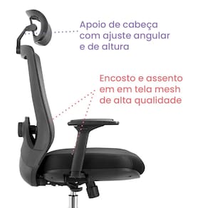 Destaques do Produto Cadeira ergonômica projetada para conforto prolongado Base giratória cromada com rodízios de 360° para mobilidade completa Regulagem de altura com sistema de amortecimento a gás Encosto e assento em tela mesh, proporcionando ventilação e resistência Apoio de cabeça ajustável em altura e ângulo Suporte lombar personalizável para postura ideal Apoios de braços em soft touch, ajustáveis em altura Sistema Back System com travas para maior estabilidade Capacidade de suporte de até 150kg com garantia de 3 anos