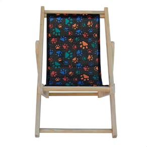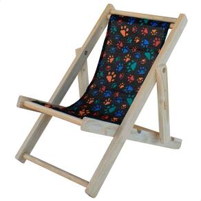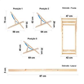 Espreguiçadeira infantil ideal para praia, piscina ou descanso em casa. Estrutura 100% madeira maciça Pinus, acabamento natural, dobrável e reclinável em 3 posições. Tecido hidro-repelente, resistente e removível para fácil limpeza. Design compacto com apoio de braço, suporta até 70 kg.