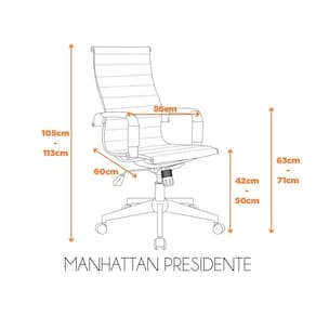 Com o estilo clássico de um assento de escritório, a cadeira Manhattan oferece praticidade para o seu usuário através das suas funções de uso. A peça conta com altura ajustável, rodízios nos pés, que facilitam a movimentação, e eixo giratório, excelente para o uso com mesas no formato de L. A cadeira giratória também é bastante confortável, pois ela conta com uma estrutura em aço cromado com revestimento em couro ecológico. Tipo de Encosto: Regulável Escala de Brilho: Fosco Produto Montado: Sim Acabamento da Estrutura: Não se Aplica Altura do assento até o chão: 50.0000 Ambiente: Escritório Ambiente Principal: Escritório Braço com Ajuste de Altura: Não codigo_ean: 7899896302410 Complexidade da Montagem: Média: pode ser montado por mais de uma pessoa e/ou necessite de maior conhecimento para montagem Cor: Preto Cor: Preto Empilhável: Não Encosto Reclinável: Sim Estrutura do Assento: Aço Estrutura do Encosto: Aço Giratória: Sim Linha ou Coleção: Manhattan Manual de Montagem e Instalação: https://product-hub-prd.madeiramadeira.com.br/328490/documents/cfea3c3c-6f0c-43e4-bd57-067b73acc382CadeiraManhattanPresidente.pdf Material da Base: Aço Necessita Montagem: Sim Peso: 12,15 kg Possui Apoio para Braços: Sim Possui Apoio Para os Pés: Não Possui LED: Não Possui Rodízio: Sim Quantidade de Itens: 1 Recomendações de Uso, Manutenção e Limpeza: Concha / Par de Braços + Revestimento dos Braços / Flange (Mecanismo) / Pistão / Anel (Acabamento entre pistão e estrela) / Rodizio (Estrela + Rodinhas) / Kit de Parafusos + Chave de Parafusos Revestimento do Assento: Couro Ecológico Revestimento do Encosto: Couro Ecológico Rodízio com Trava: Sim Sistema de Montagem: Concha / Par de Braços + Revestimento dos Braços / Flange (Mecanismo) / Pistão / Anel (Acabamento entre pistão e estrela) / Rodizio (Estrela + Rodinhas) / Kit de Parafusos + Chave de Parafusos Suporta Até (kg): 150 kg Tipo de Assento: Regulável