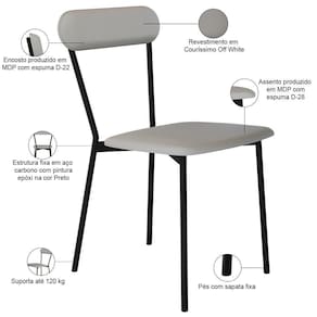 Model: Liora | OriginCountry: | É cadeira de balanço: Não | É dobrável: Não | Altura do assento a partir do solo: 49 cm | Cor: Off White | OriginState: PR | ProductContents: 01 Cadeira | Profundidade da cadeira: 53 cm | Largura do assento: 43 cm | Peso máximo suportado: 120 kg | ColorFamily: Off White | ColorSimple: Off White | SizeDescription: Altura: 81 cm x Largura: 43 cm x Profundidade: 53 cm | SupplierSimpleName: Cadeira Estofada Para Sala de Jantar Liora Preto C01 Courino Off White - Lyam Decor | ProductLength: 53 cm | ProductWidth: 43 cm | ProductWarranty: 90 dias após o do produto | ProductHeight: 81 cm | Material do estofamento: Espuma D-22 e D-28 | Requer montagem: Não | Tempo de montagem: na | Color: OFF WHITE | Fabricante: Lyam Decor | Desenho do tecido: Liso | Altura da cadeira: 81 cm | Largura da cadeira: 43 cm | Material: Estrutura em Aço e MDP, Revestimento em Couro sintético e espuma | ColorSupplier: Off White | ProductInstructions: Produto para uso em ambiente interno, nao devendo ficar exposto ao sol, calor e umidade excessivos. | Cor da estrutura da cadeira: Preto | Profundidade do assento: 53 cm | Espessura do assento: na | MaterialFamily: Aço, MDP, Couro sintético e Espuma | ProductWeight: 5,5 kg | Cor do estofamento: Off White | Cor do assento: Off White | Firmeza: Firme | É empilhável: Não