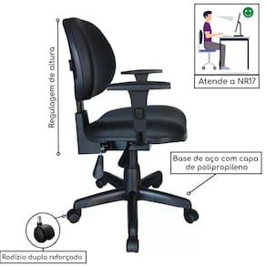 Material da Base: Pistão à Gás / Aranha Preta / Plataforma Back System Outros Recursos / Mais informações: 05 Rodízios Duplos / Telescópio 03 Estágios / Contra Capa Plástica / Regulagem Angular de Encosto Composição: Assento e Encosto / Mecanismo de Regulagem Angular de Encosto / Base Giratória Marca: Martiflex / Plaxmetal / MR Plast