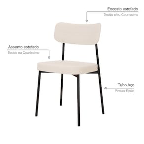 Sobre o ProdutoCadeira Fixa Estofada Mynna CD4PMY50 Tecido-Est.AçoDescrição do Produto:A Cadeira Mynna é uma peça que alia sofisticação e funcionalidade. Com estrutura em tubos de aço cortados e soldados a laser, oferece um design robusto e moderno, perfeito para ambientes contemporâneos. Seu encosto anatômico proporciona conforto extra, enquanto as opções de acabamento em tecido ou courino permitem combinações elegantes e versáteis. Ideal para dar um toque de estilo e aconchego em qualquer espaço, a Cadeira Mynna é uma escolha refinada para compor seu ambiente com personalidade e bom gosto.A linha Metalig Design oferece móveis e cadeiras de design exclusivo, desenvolvidos por uma equipe própria de designers e projetistas. Combinando inovação, alta qualidade e durabilidade, cada peça é feita com materiais sustentáveis e acabamento superior, garantindo elegância e funcionalidade para transformar qualquer ambiente. Metalig, arte em aço que democratiza o design.Itens Inclusos:1 CadeiraDimensões dos Produtos:Cadeira Fixa Estofada Mynna CD4PMY50 Tecido-Est.Aço: 49,5 x 52 x 79 cmInformações Logísticas (Comp. X Prof. X Alt.):Vol.01: 81 x 65 x 13,5 cm Peso: 6,2 KgPeso Total: 6,2 KgObservações:Não acompanha acessórios decorativos. Imagens meramente ilustrativas.Informações Técnicas / Características: Cor do Produto: Tecido-Est.Aço Cor do Predominante: Revestido Marca: Metalig Modelo: CD4PMY50 Linha: Metalig Design Material Principal / Composição: Aço/Madeira Multilaminada/MDP/Espuma/Tecido Material / Estrutura do Encosto: Madeira Multilaminada Material da Estrutura / Pés: Aço Acabamento Estrutura: Epóxi-Pó Tipo do Encosto: Fixo Anatômico Revestimento Encosto: Tecido Tipo do Assento: Fixo Material / Estrutura do Assento: MDP Enchimento Assento: Espuma D-28 Revestimento Assento: Tecido Possui Braços: Não Tipo: Cadeira Modelo: Fixo Empilhável: Não Dobrável: Não Ambiente Principal: Sala de Estar / Jantar Estilo: Contemporâneo Enchimento Encosto: Espuma D-22 Suporta Até (kg): 120kg Comprimento: 49,5cm Profundidade: 52cm Altura: 79cmAltura do Assento até o chão: 48cm Altura do Encosto até o chão: 57cm Dimensões do Assento: 46x45x6,5cmcm Dimensões do Encosto: 49,5x21x4,5cmcm Peso Líq.: 5,28Kg Recomendações de Uso, Manutenção e Limpeza: Para a limpeza, utilize flanela seca ou pano macio levemente umedecido em água. Utilize um pano seco em seguida. Evite contato com produtos químicos (solventes, thinner, acetona, etc) e não utilize nenhum tipo de esponja de aço. Necessita de Montagem: Sim / Acompanha Manual de Montagem Complexidade da Montagem: Média: pode ser montado por mais de uma pessoa e/ou necessite de maior conhecimento para montagem. Garantia: 6 meses