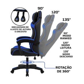 O assento possui ajuste de altura com pistão a gás, permitindo que você encontre a posição perfeita em relação à sua mesa. O encosto reclinável entre 90° e 135° oferece versatilidade para alternar entre foco total e momentos de descanso, com controle de resistência e travamento da inclinação para maior estabilidade.