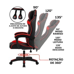 O assento possui ajuste de altura com pistão a gás, permitindo que você encontre a posição perfeita em relação à sua mesa. O encosto reclinável entre 90° e 135° oferece versatilidade para alternar entre foco total e momentos de descanso, com controle de resistência e travamento da inclinação para maior estabilidade.