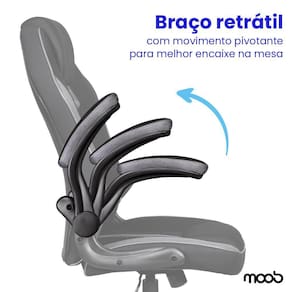 Os braços da cadeira são pivotantes, um mecanismo inovador que permite levantar e abaixar os braços para ajustar a cadeira à mesa. Isso permite que você encontre o encaixe ideal para longas e confortáveis horas de uso.