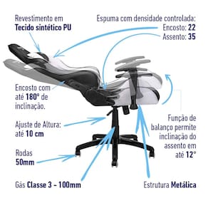 Informações Adicionais A nova linha de Cadeira Gamer Mymax, são as mais iradas do mercado, a MX5 possui design ergonômico e revestimento em tecido sintético. Projetada para proporcionar conforto mesmo após horas jogando. Esse conforto foi obtido através do uso de espuma injetada de alta densidade no encosto e assento, aliado a possibilidade de inclinar o encosto em até 180° e da função balanço.