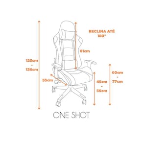 A cadeira Gamer que você precisa! A Gamer One Shot é toda em couro ecológico com sua base em nylon. Ela possui o sistema relax e seu encosto inclina até 180° ficando totalmente deitada, o que torna ela ainda mais confortável. Além de possuir regulagem da altura do braço, para que se adeque a qualquer mesa que for encostada. Acabamento da Estrutura: Não se Aplica Almofada do assento: Altura do assento até o chão: 56 Ambiente Principal: Quarto Apoio para Braços Estofado: Braço com Ajuste de Altura: Não Complexidade da Montagem: Média: pode ser montado por mais de uma pessoa e/ou necessite de maior conhecimento para montagem Cor: Preto/Cinza Cor da Base: Preto Cor do Produto: Preto/Cinza Dobrável: Empilhável: Não Enchimento do Assento: Enchimento do Encosto: Encosto Reclinável: Sim Escala de Brilho: Fosco Estrutura do Assento: Madeira Estrutura do Encosto: Madeira Giratória: Informações Complementares: Itens Inclusos: 1 Cadeira, Kit Ferragens e Manual de Instruções Linha ou Coleção: Gamer One Shot Manual de Especificação Técnica: Manual de Montagem e Instalação: https://cdn2.madeiramadeira.com.br/atributo/fratini/1113188-cadeira-gamer-one-shot-ref-285.pdf Material da Base: Aço Necessita Montagem: Sim Origem do Produto: Importado Peso: 15.69 Possui Apoio para Braços: Sim Possui Apoio Para os Pés: Possui LED: Não Possui Rodízio: Sim Recomendações de Uso, Manutenção e Limpeza: Pano úmido Revestimento do Assento: Couro Ecológico Revestimento do Encosto: Couro Ecológico Rodízio com Trava: Sistema de Montagem: Encosto, Assento, Almofada Apoio de Cabeça e Lombar, Par de Braços, Flange, Pistão, Capa Telescópica, Rodizio, Kit de Parafusos e Chave de Parafusos Suporta Até (kg): 120 Tipo de Assento: Regulável Tipo de Encosto: Regulável Tipo de Madeira Maciça: Pinus