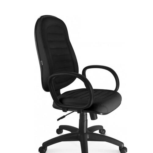 Cadeira giratória modelo presidente de espaldar alto com assento e encosto estruturado em madeira laminada e estofado com espuma injetada com densidade D45. Revestimento em sintético preto.