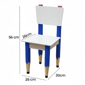 Cadeira Infantil Lápis Azul Assento E Encosto Brancos Para Estudos E Desenhos Mobília Decor Cadeirinha Infantil Pé Lápis Borracha Cadeirinha com pés sextavados em formato de lápis na cor e acabamento Branco TX, ideal para quartos infantis, brinquedotecas e escolinhas, combinando leveza, resistência e visual divertido.? Dimensões e capacidade: 55 cm de altura total (assento a 29 cm), 26 x 26 cm; peso 2,4 kg; suporta até 40 kg.?